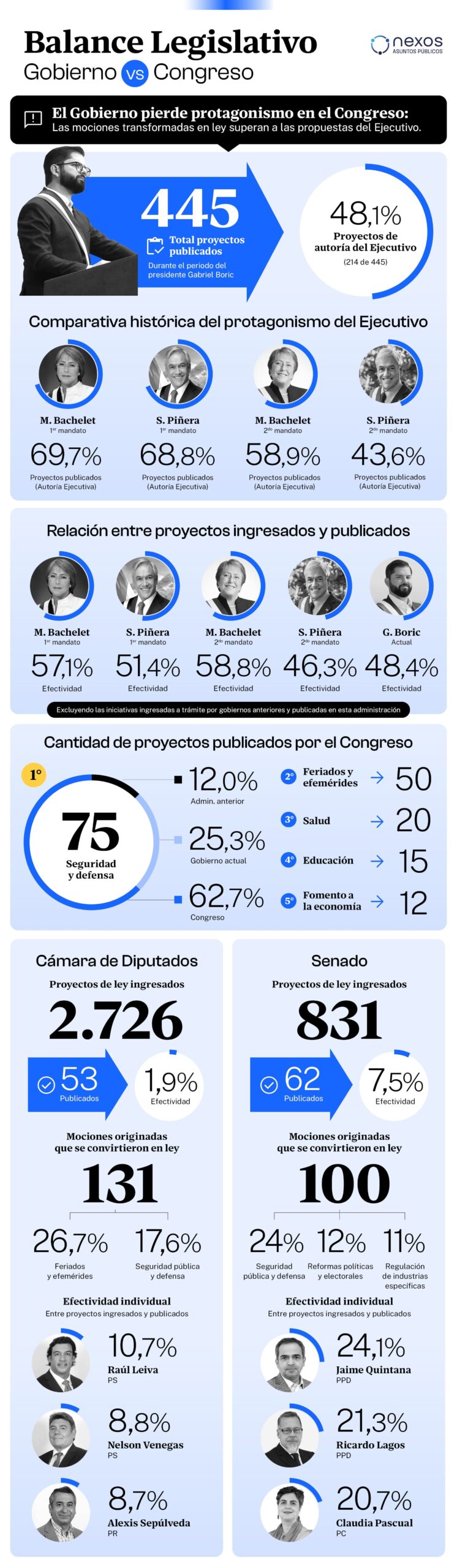 El equipo de Asuntos Públicos y Regulatorios de Nexos elaboró un estudio que mide la efectividad legislativa del actual Gobierno y del Congreso, con un análisis comparativo respecto de administraciones anteriores, y las principales materias que se transformaron en ley.